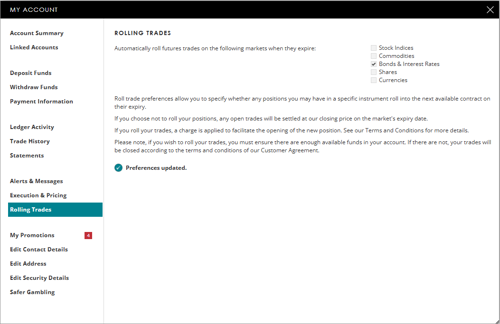 When you first open the account, as a default setting, all preferences are set for trades not to roll. If you wish for your trades to roll past their respective expiry dates it is essential that you have updated these preferences.