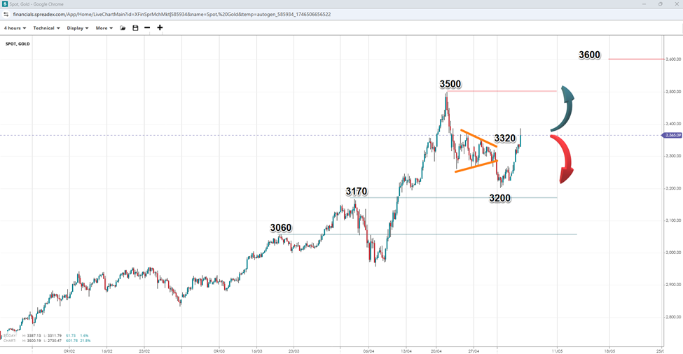 After possibly ending a correction at $3200 per ounce that involved a triangle pattern, gold has started to move towards the record peak of $3500. If bulls reclaim the $3400 and $3450 levels in the short term, gold may reclaim the top and even extend to $3550 and $3600, both round levels higher up. However, losing the $3320 support will increase the risk of breaking below regional support at $3170 and may open the door to $3060.