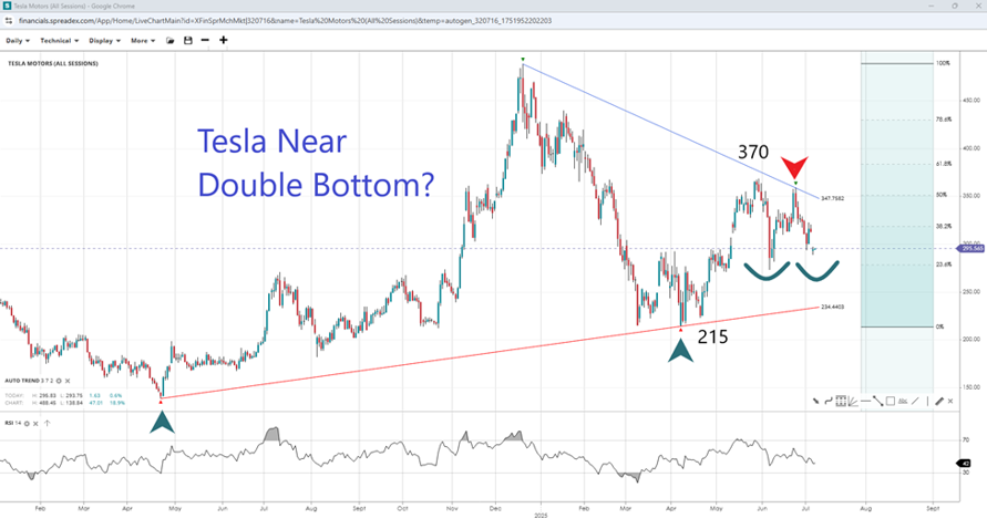 After failing to break through the $350 trendline resistance in late June, which coincides with the 50% Fibonacci, Tesla may be heading towards a double-bottom support at $270. As the long-term price action suggests a tightening consolidation, the opposing ‘autotrend’ trendline could offer support near $250 (currently at $235). However, a break above the $300 level and the ‘autotrend’ trendline could open the door to $370 and the $400 handle, while further declines may expose $215 and $200.