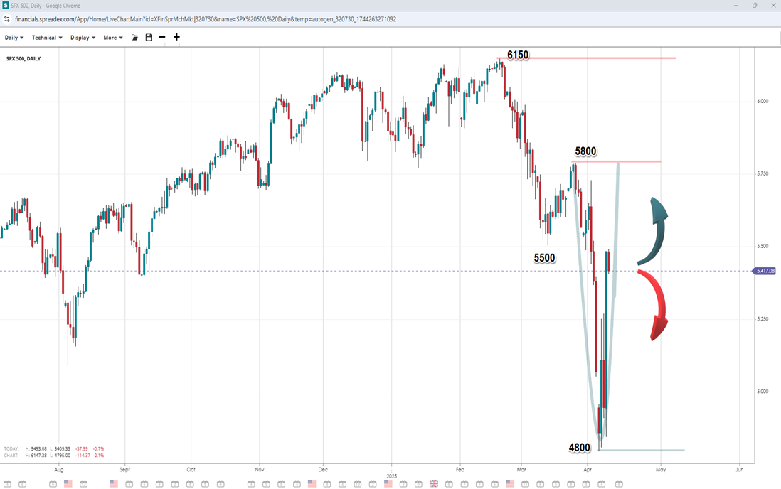 After a sharp sell-off following a dead cat bounce earlier in the week, the S&P 500 crashed to 4800 just to reveal a V-bottom pattern in the aftermath of the tariff postponement. Breaking past the 5500 'neckline' could open the door to 5800 and eventually the record peak of 6150. On the other hand, failing to get through either of the near-term resistance levels would suggest a period of consolidation and could lead to further declines. Near-term supports lie at 5250 and the 5000 mark.