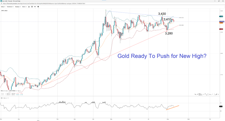 The spot price of gold has trended upward for the last couple of weeks, with the most recent pullback giving headroom if it were to try to retake previous highs. If that were the case, it would encounter resistance at the prior swing high at $3,410 per ounce, and, by extension, would head toward the July high of $3,430 resistance level. If the pullback intensifies, gold could find support at the swing low of $3,280 before hitting the psychological $3,250 level that it bounced off of back in June.