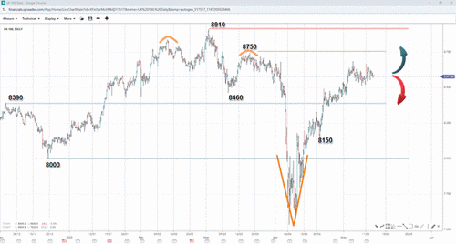 The Footsie completed the bearish correction of a completed head-and-shoulders (H&S) pattern on its way down near 7500, suggesting a failed dead-cat-bounce (DCB) and a full V-shaped recovery above the 8460 neckline. If bulls can maintain support, prices could accelerate towards the record high of 8910 through the 8750 right-shoulder peak. However, sliding under 8390 might open the door to the 8000 handle should the 8150 support give way to bearish price action.