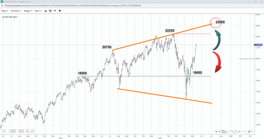The tech-heavy Nasdaq has surged into bull market territory as trade optimism appears to fuel a resurgence in tech enthusiasm. The Fed's rate cut expectations and lower-than-expected inflation data also provide further tailwinds for the index. However, the technical picture raises questions, with a potential broadening top pattern suggesting short-term gains towards the 23000 handle, which may see Nasdaq top out and trigger a reversal.