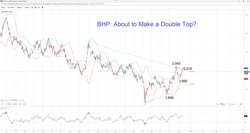 Through August to date, BHP's share price has been rising, but it took a breather ahead of earnings. Moving above the psychologically important 2,000p level, it faces resistance at the nearest swing high at 2,015, with the July maximum of 2,043 providing resistance above that. If the double top were to consolidate in the near term, the share price has the latest swing low at 1,890 for support. A break below that exposes the prior low in June at 1,690.