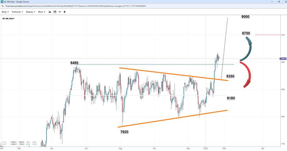 The FTSE 100 commenced the week by achieving its second consecutive record high, with analysts partially pinning the latest gains on the inauguration of US President Donald Trump. This followed a disappointing UK retail sales report on Friday that spurred hopes of interest rate cuts by the BOE in the coming months. The subsequent weakening of the pound was viewed as favourable for UK firms reporting earnings as early reports on Monday suggested that Trump would adopt a more gradual approach to tariffs, leading to a broad relief rally in equities. Large British companies listed on the FTSE 100 with global exposure could be among the most affected by trade wars.
