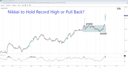 Nikkei broke outside of a consolidation pattern near 45900 to begin the month of October on a positive footing. The measured move projection pointed to 47600, but this has already been achieved after a surge past the peak of 46150, setting the stage for 49k and even 50k. However, the RSI remains in overbought territory. The index could face a short-term pullback to the (now) measured-move support, followed by lower levels towards 44300 if bearish bets accelerate below 45k.
