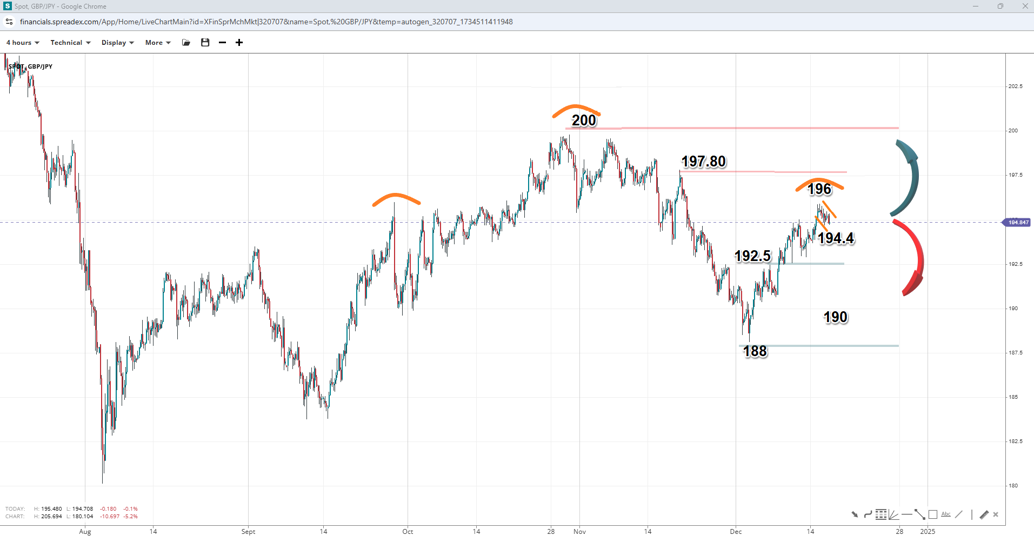 As central banks move towards easing, carry traders might find refuge with the pound, as the BOE is expected to be the slowest of the major central banks to normalise rates. This means it might be up to the BOJ to close the interest rate gap between the currencies. But that might be hampered because the BOJ takes a very cautious approach to hiking. After the latest UK data, it could come down to the vote split at the BOE meeting to determine whether carry traders manage a sigh of relief and the currency pair heads towards 200 or forms another peak and starts trending downward.