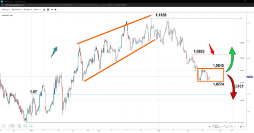 By contrast, the ECB is expected to keep hiking for several more meetings, narrowing the shared economy and the US rate gap. For now, the dollar might be picking up a bit of strength with higher yields as traders worry about the ramifications of brinkmanship over spending in Washington. But when that's resolved, the Euro might catch up on the yield differential a little more - unless the FOMC minutes heavily imply another rate hike is coming.