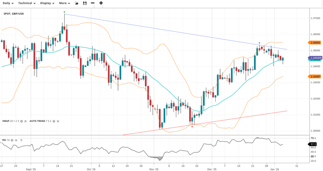 GBP/USD remains in a bullish trend but is in a corrective phase, trading at 1.3455 in line with its VWAP of 1.3450. RSI at 57.2 signals continued underlying strength. Support is seen at 1.3339 and resistance at 1.3549.