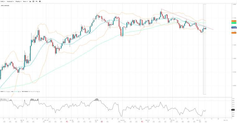 EUR/USD stays under bearish pressure but has entered a pullback back up towards the VWAP of 1.1584. RSI at 46.6 shows consolidation after prior weakness. Support is at 1.1476, resistance at 1.1693.