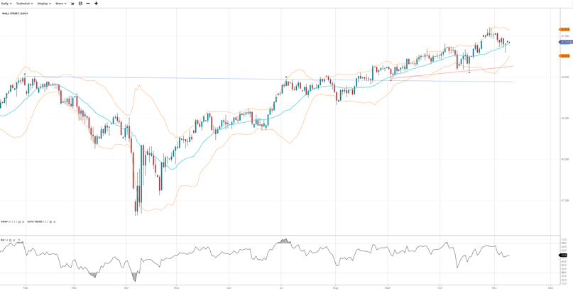 Wall Street remains bullish in a pullback phase, with price at 47,165 aligned closely with the VWAP at 47,100. RSI at 63.8 signals steady demand and room before overbought conditions. Support is at 46,312, resistance at 47,919.