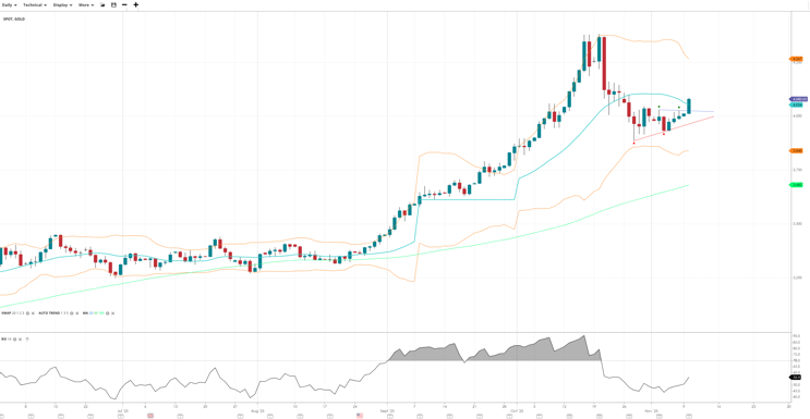 Gold is seemingly breaking back higher after a correction phase, priced at 4,000 just below the VWAP of 4,054. RSI at 56.4 reflects balanced momentum after strong gains. Support stands at 3,840, resistance at 4,267.