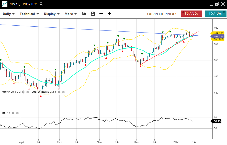 USD/JPY is trading in a tight correction within its bullish trend, trading at 157.36, aligned with the VWAP (20) of 157.40. Support is noted at 156.58, and resistance is at 158.27. The RSI at 56 indicates flat momentum.