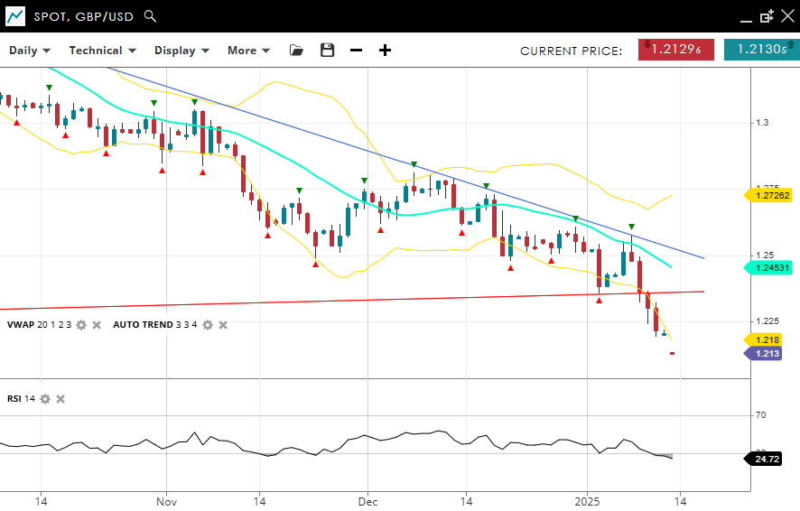 GBP/USD is falling like a rock - continuing its bearish impulsive move, trading at 1.2130, significantly below the VWAP (20) of 1.2453. Support stands at 1.2180, while resistance is found at 1.2726. The RSI at 30 reflects oversold momentum, aligning with continued bearish sentiment.