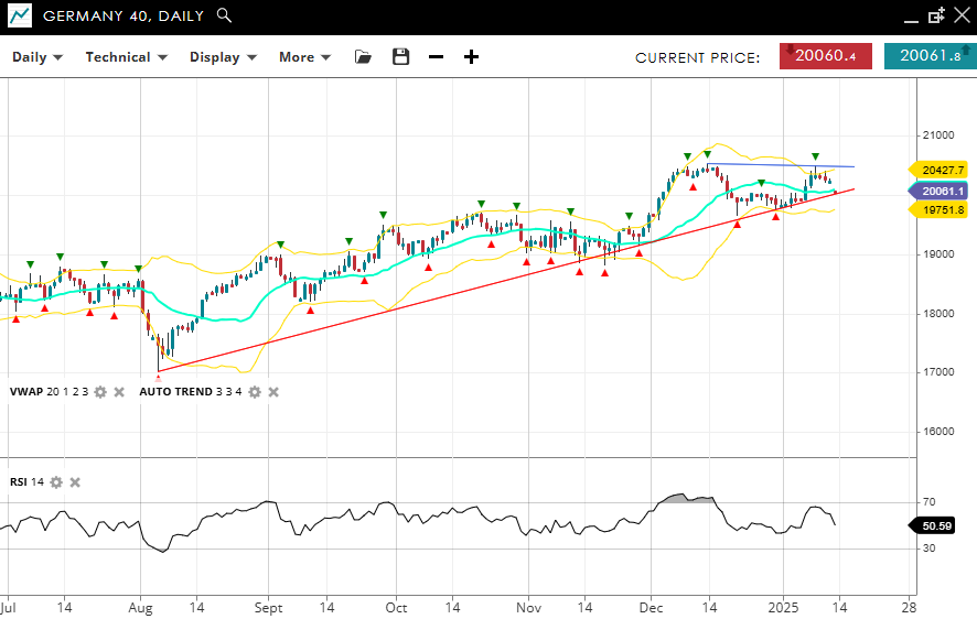 Germany 40 continues its bullish correction phase, currently trading at 20,061, just below the VWAP (20) level of 20,100. Key support lies at 19,751, while resistance is identified at 20,427. The RSI at 50 suggests neutral momentum, matching the pause in market direction.