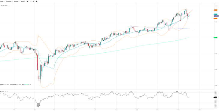 UK 100 continues its bullish trend but is in a short-term pullback. Price at 9,689 trades back below the VWAP of 9,743. RSI at 51.2 indicates neutral momentum. Support sits at 9,611, resistance at 9,875.