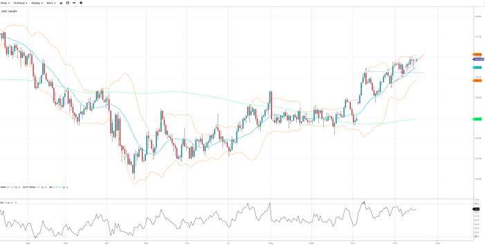 USD/JPY holds a bullish bias - pushing into the 155 round number, trading at 154.72 above the VWAP of 153.72. RSI at 63.8 confirms ongoing, yet fading, upward momentum. Support lies at 152.11, resistance at 155.33.