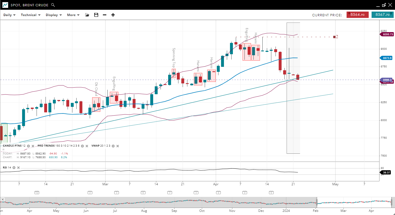 Brent Crude remains bullish with an upwards sloping VWAP but has transitioned to a corrective phase. The price has dropped to 85.66, below the VWAP of 88.73. Support has been set at 85.41, with resistance not far off at 92.05. An RSI of 39 indicates a significant reduction in bullish momentum.