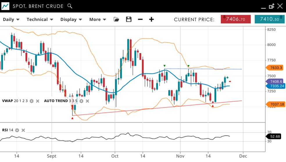 Brent Crude is neutral in a consolidation phase, trading at 7408, having bounced off major support at 70 again, slightly above the VWAP (20) of 7335. Support is at 7037, with resistance at 7,633. The RSI at 52 reflects the range-bound conditions, with no clear directional bias.