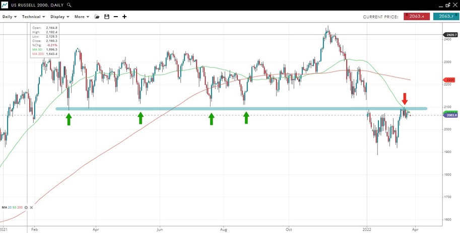 The Russell 2000 has barely been participating in the rally off the March lows and is stuck at former support now resistance at 2100. A break above here would add strength to the boarder equity rally.