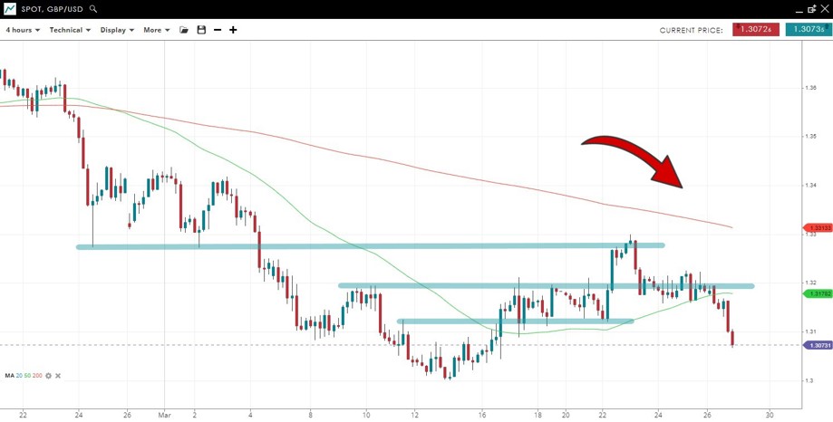 Sterling hit resistance from the matching lows in late Feb and early March and has since dropped back under broken resistance at 1.32 for a likely re-test of the 1.30 lows.