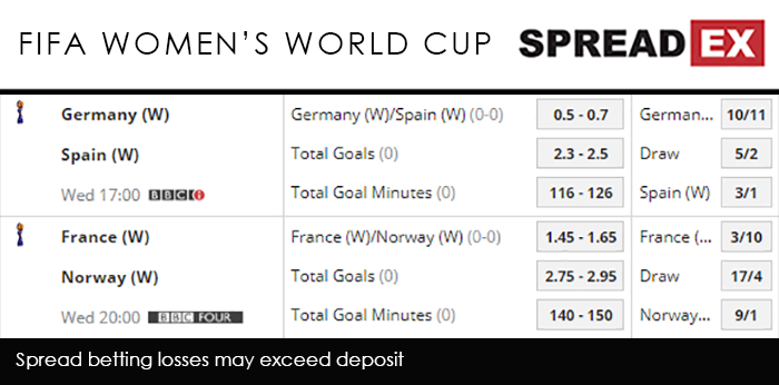 Norway weren’t far off when they faced Nigeria, bulging the back of the net 3 times in less than 40 minutes – the third being an own goal courtesy of Osinachi Ohale – to secure a 3-0 win. Corinne Diacre’s side will be feeling confident heading into Wednesday night, and likely have it in them to beat the 1995 champions, with Spreadex offering a France/Norway Goal Supremacy spread of 1.45-1.65, alongside a Total Goals spread of 2.75-2.95. In Wednesday’s other big fixture, Group B favourites Germany and Spain do battle at 5pm on BBCi. The Germans, who are 2nd only to the USA in terms of their record in the World Cup, survived a scare in their first game, with a 66th minute goal from Giulia Gwinn the only thing separating them and China. Despite beating South Africa 3-1, Spain were equally uncomfortable in their opening outing. Going 1-0 down in the 25th minute, it took a 69th minute penalty from Jenni Hermoso for them to draw level. Another converted spot kick from Hermoso put them in front with 8 minutes to go, with Lucia Garcia cementing the win right at the end of the game. Die Nationalelf – who are expected to at least reach the semis, at an Outright Index spread of 42-46 to Spain’s 24-27 – will be looking to take control of Group B in Valenciennes, with Spreadex offering a Germany/Spain Goal Supremacy spread of 0.5-0.7, alongside a Total Goals spread of 2.3-2.5.