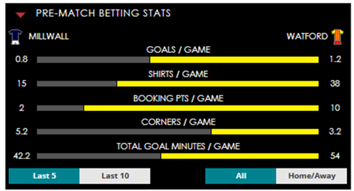 To see all the Millwall v Watford betting stats and form, visit our pricing page to view our Pre-Match betting stats table or hover over/tap the chart image to see previous outcomes for that particular market.