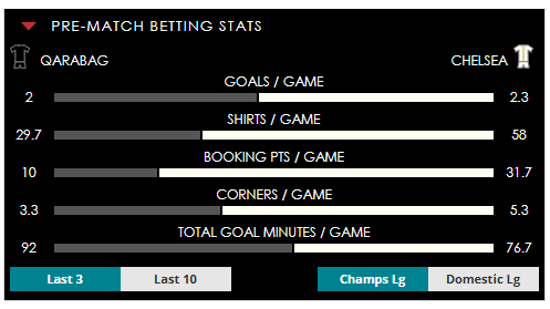 To see all the Qarabag v Chelsea betting stats and form, visit our pricing page to view our Pre-Match betting stats table or hover over/tap the chart image to see previous outcomes for that particular market.
