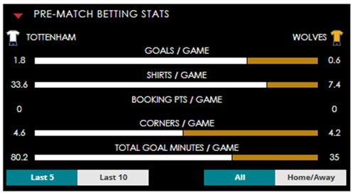 To see all the Tottenham v Wolves betting stats and form, visit our pricing page to view our Pre-Match betting stats table or hover over/tap the chart image to see previous outcomes for that particular market.